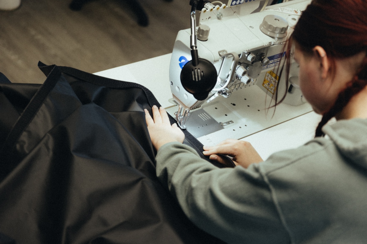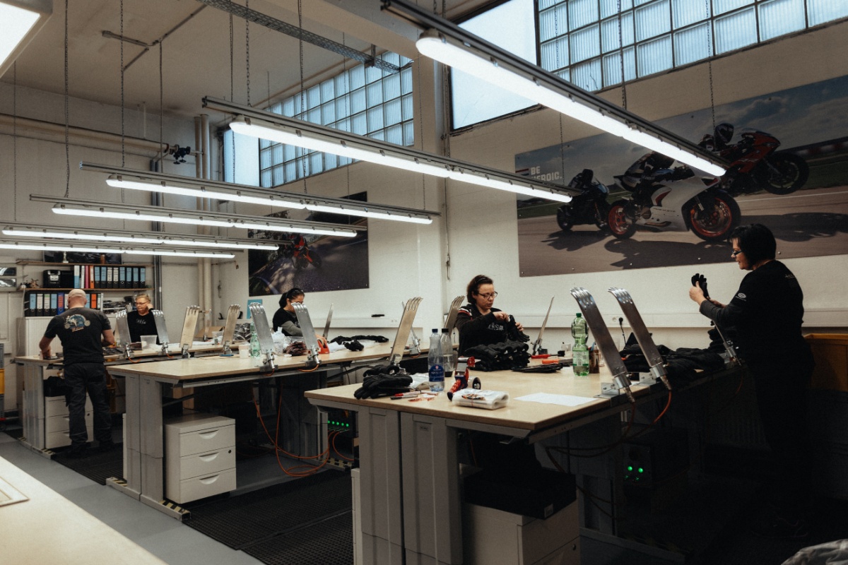 W dalszej części szwalni znaleźliśmy pomieszczenie, w którym od podstaw szwaczki produkują jeansy motocyklowe. Stephan dumnie powiedział, że to produkt Made in Germany – w 100%, w całości!