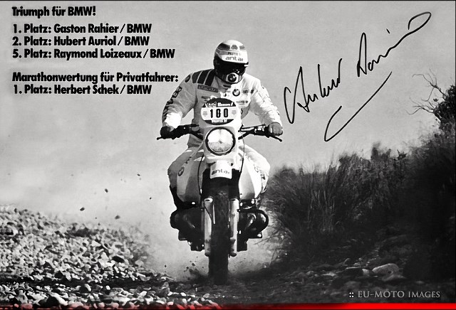 Najbardziej rozpoznawalną cechą motocykla stał się potężny zbiornik paliwa. Aby mieć pewność, że wszystko pójdzie dobrze, zatrudniono czołówkę ówczesnych zawodników. Efekt był wstrząsający. Dosiadający BMW Hubert Auriol dotarł na metę z sensacyjną, trzygodzinną przewagą nad jednocylindrową Yamahą.