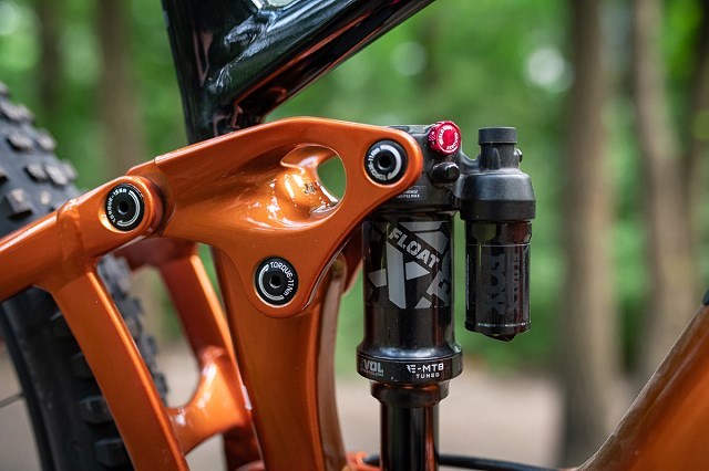 Choć oczywiście cały osprzęt wrzuciliśmy na końcu artykułu, także i w jego treści nie może zabraknąć opisu elementów budujących ten rower. Jego największą zaletą, oprócz oczywiście wspomagania, jest jego zawieszenie. Mamy do czynienia z rewelacyjnymi damperami firmy Fox, czyli przednim zawiasem Float Performance o średnicy goleni 36 mm oraz tylnym amortyzatorem Float X Performance. Oczywiście oba powietrzne, oba z możliwością ich blokady lub zmiany charakterystyki pracy, oba dostosowane przez producenta do działania w cięższym rowerze elektrycznym.