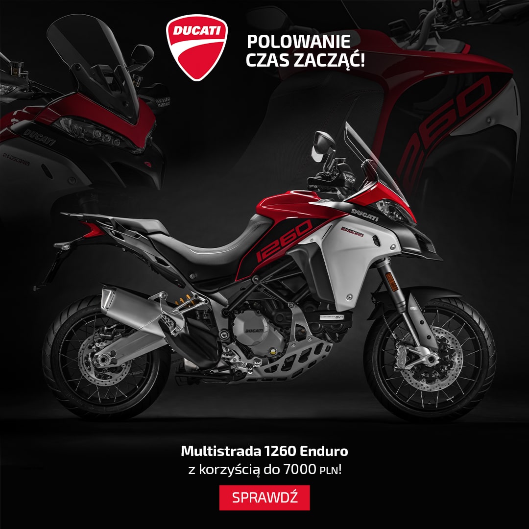 Największą korzyść osiągnie ten, kto złowi Multistradę 1260 w wersji Enduro. Ten wyprawowy motocykl, będący ubiegłoroczną nowością, wyposażono w silnik Testastretta DVT o pojemności 1262 cm3 ze zmiennymi fazami rozrządu, dysponuje on mocą 158 KM i momentem obrotowym sięgającym 128 Nm. Do tego najnowocześniejsza, sportowa elektronika, wspaniała ergonomia, topowe zawieszenie i hamulce – to zdecydowanie najszybsze i najmocniejsze enduro na świecie! Tylko teraz możesz trafić je taniej o dokładnie 7000 zł.