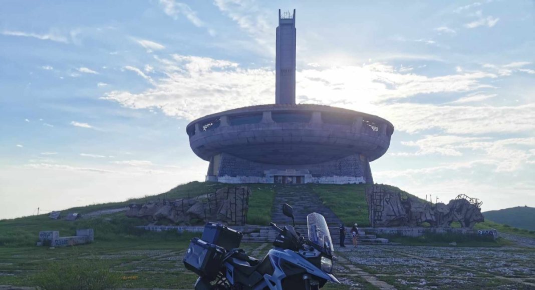 Na koniec dnia zostawiamy sobie obowiązkowy punkt motocyklowych wycieczek do Bułgarii, czyli słynny kosmiczno-żałosny obiekt na szczycie Buzłudży. Betonowy spodek i towarzysząca mu 70-metrowa wieża to Dom-Pomnik Komunistycznej Partii Bułgarii. Obiekt powstał z inicjatywy wieloletniego pierwszego sekretarza, Todora Żiwkowa, i został ukończony w 1981 roku. Miejsce wybrano nieprzypadkowo – na Buzłudży pod koniec XIX wieku odbył się kongres, który dał początek pierwszej w tym kraju partii socjaldemokratycznej.