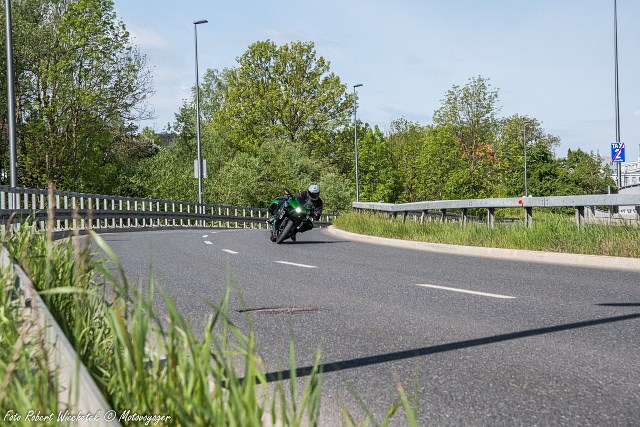 W trasie!? Chyba śmiało mogę powiedzieć, że trudno znaleźć obecnie na rynku analogię dla tego sprzętu oprócz wspomnianej już wcześniej Hajki. Oba te motocykle to połykacze autostradowych kilometrów, najlepiej tych za Odrą. Bo tylko gdy H2 jest na równej drodze, na której nie ma ograniczeń prędkości, a widoczność sięga po horyzont, może pokazać na co ją stać i po co została stworzona. Sprzęt ten prowadzi się stabilnie przy każdej prędkości. Rozpędziłem się nim chwilowo do 250 km/h. Tak, z kuframi. Tak z pasażerką. Tak, na niemieckiej autostradzie. Jechał jak po sznurku, mimo bardzo wietrznych warunków, jakie ostatnio nam towarzyszą. Odpuściłem, bo wygrał zdrowy rozsądek (o ile można o nim mówić, kiedy pozwala rozpędzić się do takiej prędkości). Ale uwierzcie mi. To co przy 100 km/h na MZ jest walką o życie, na Fazerze przy 200, to przy 250 km/h dla Kawy jest spacerkiem po parku. Motocykl tej jest tak wyważony i tak doskonale zwarty i zaprojektowany aerodynamicznie, że jazda nim z absolutnie każdą, nawet kosmiczną prędkością, to komfort i przyjemność. Dlatego też zielony smok ze mną wygrał, bo on dopiero łapał drugi oddech, a ja nie chciałem przeginać.