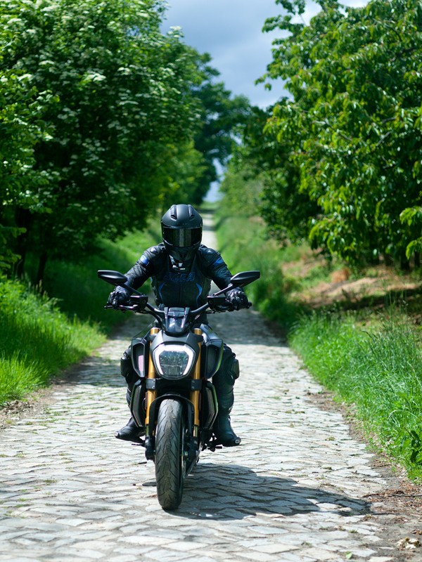 Przy gwałtownym ruchu manetką wręcz wypycha mnie do przodu jak kulę armatnią, nad której trajektorią czuwa genialna elektronika, ale o niej za chwilę… Seryjny układ wydechowy brzmi dobrze i nie męczy podczas podróży. Ma swój charakterystyczny dla Ducati gang. Potężne V2 wprawdzie emituje drgania ramy, ale co ciekawe nie sposób je odczuć na samej kierownicy, jest ona bardzo dobrze odseparowana od wpływu wibracji, co najłatwiej można spostrzec w lusterkach wstecznych – duży plus!