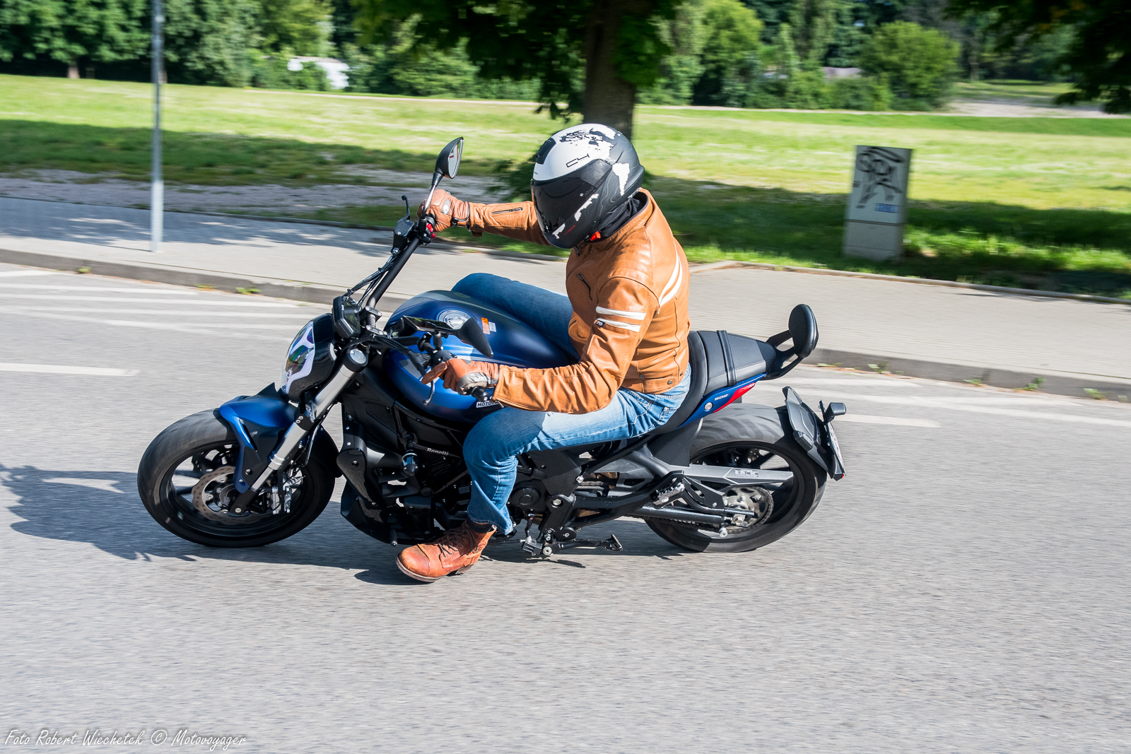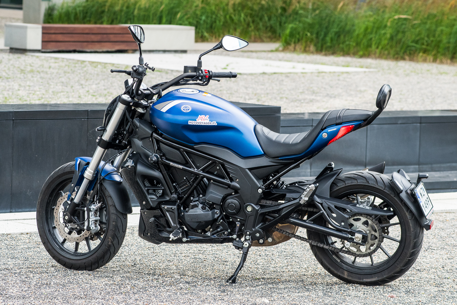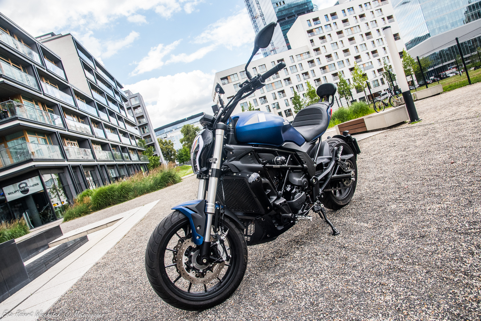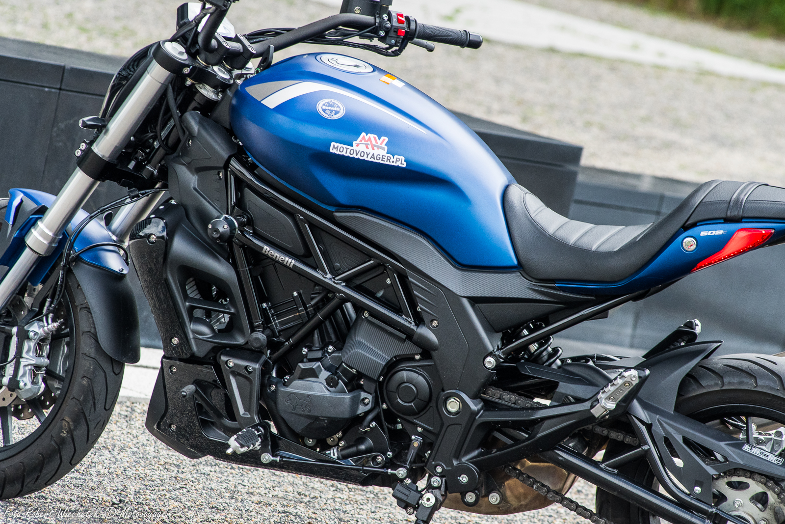 Zaskakująco dobrze! Przy jeździe na wprost, nawet przy maksymalnych prędkościach, nie wężykuje i prowadzi się jak po sznurku. Świetnie chodzi po winklach i zachęca do mocniejszych przechyłów. Szeroko poprowadzone podnóżki sprawią, że w głębszym złożeniu poczujesz się jak Rossi, trąc nimi o asfalt. To wszystko możliwe jest dzięki bardzo dobrze pracującemu zawieszeniu, mało chopperowej ramie z normalnym kątem główki oraz świetnym oponom stosowanym przez Benelli na pierwszy montaż – czyli Pirelli Angel ST.