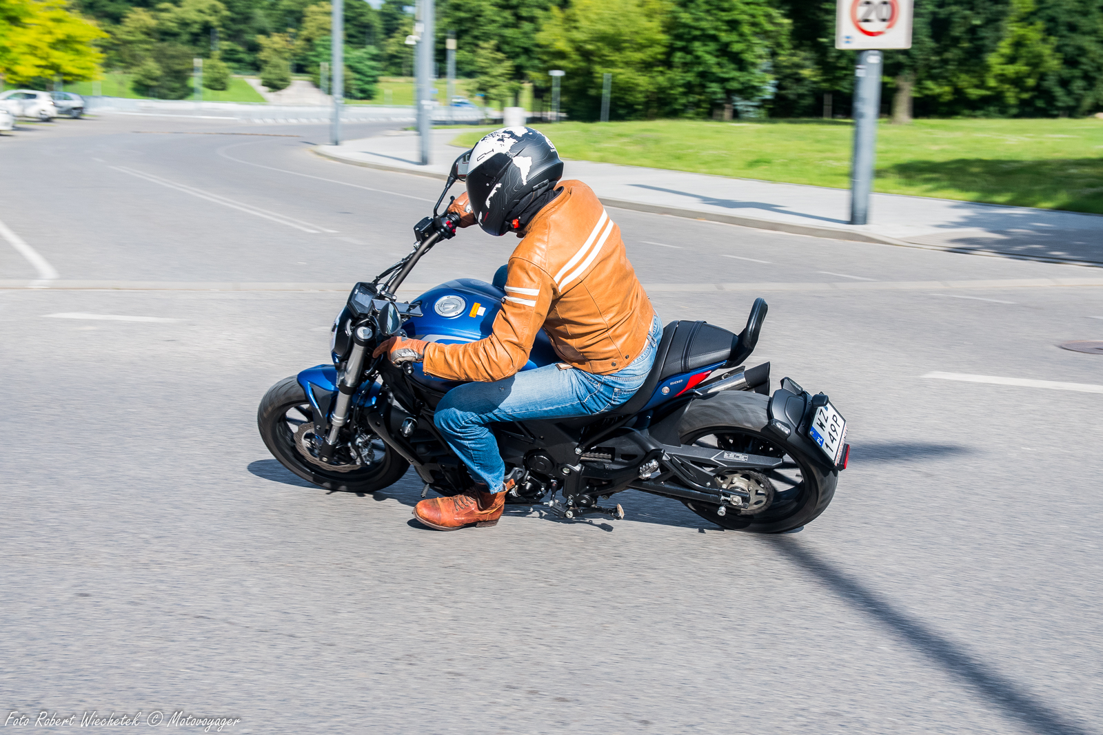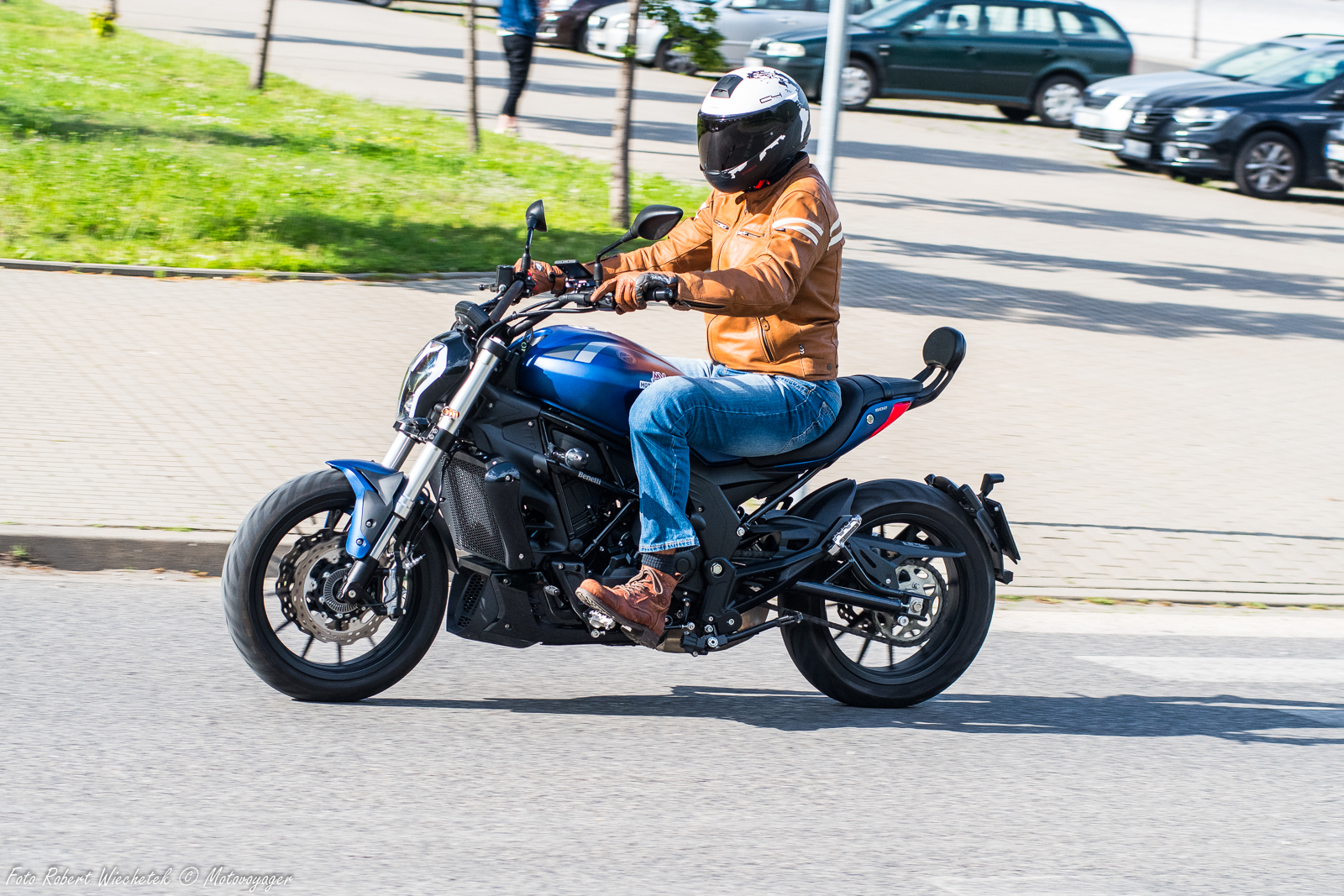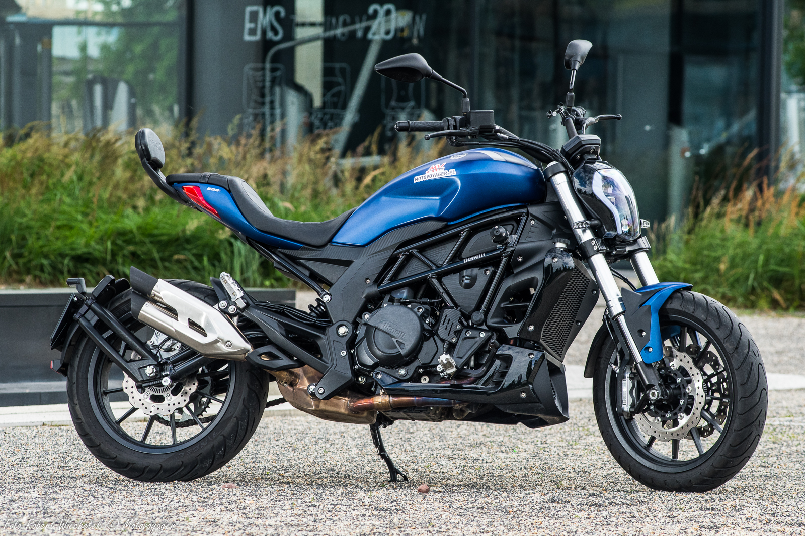 Zaskakująco dobrze! Przy jeździe na wprost, nawet przy maksymalnych prędkościach, nie wężykuje i prowadzi się jak po sznurku. Świetnie chodzi po winklach i zachęca do mocniejszych przechyłów. Szeroko poprowadzone podnóżki sprawią, że w głębszym złożeniu poczujesz się jak Rossi, trąc nimi o asfalt. To wszystko możliwe jest dzięki bardzo dobrze pracującemu zawieszeniu, mało chopperowej ramie z normalnym kątem główki oraz świetnym oponom stosowanym przez Benelli na pierwszy montaż – czyli Pirelli Angel ST.