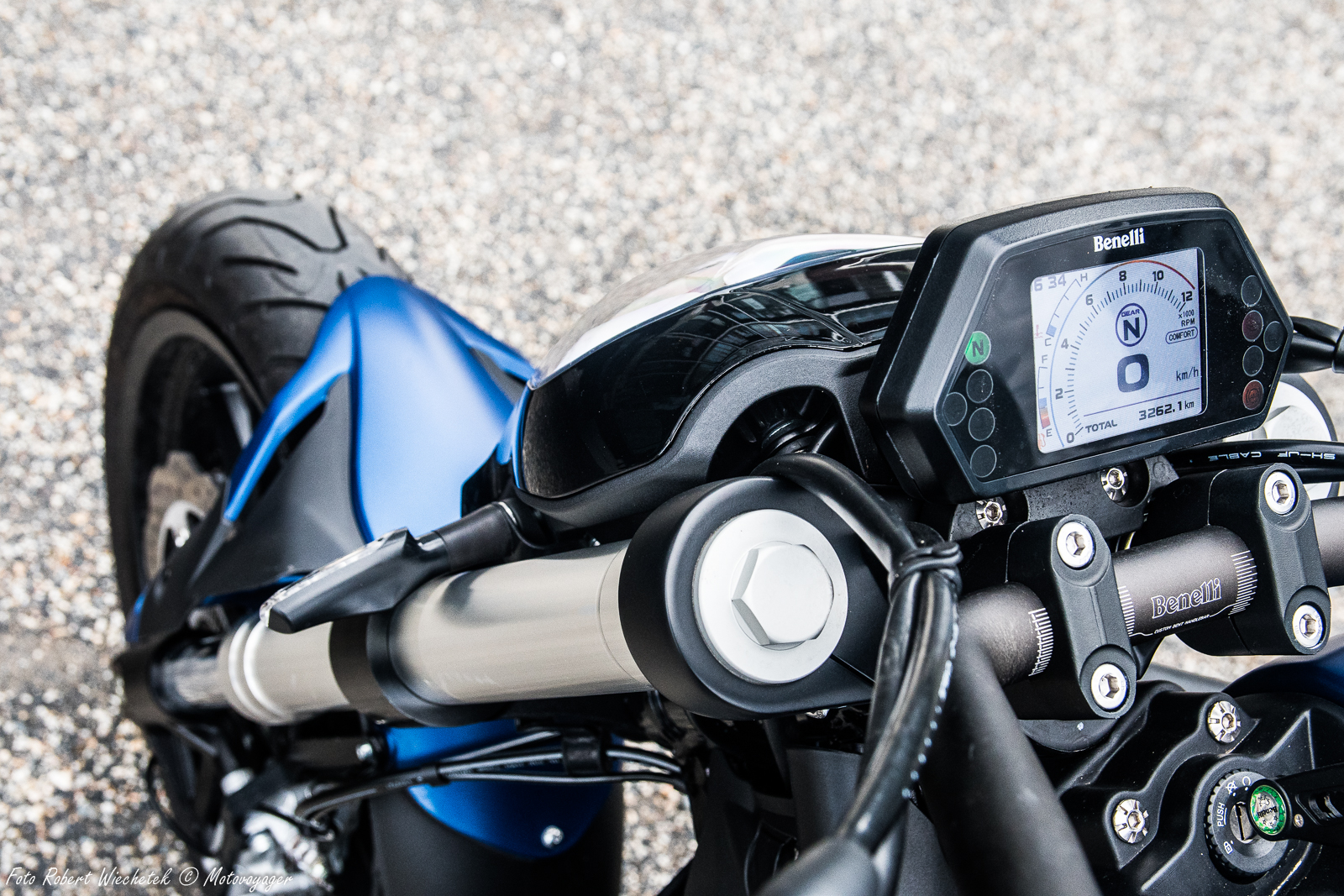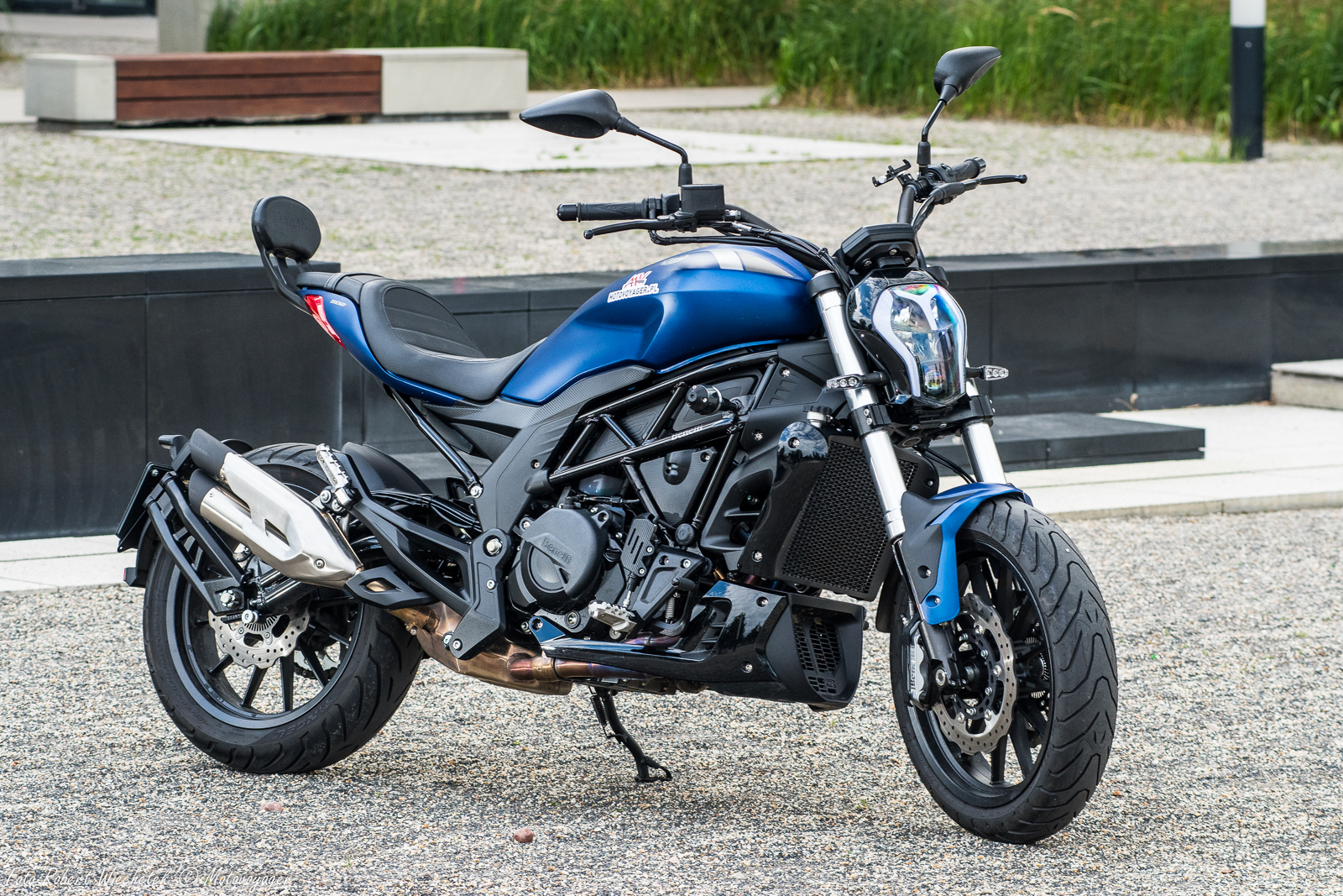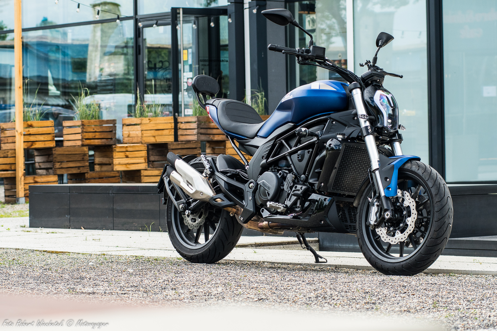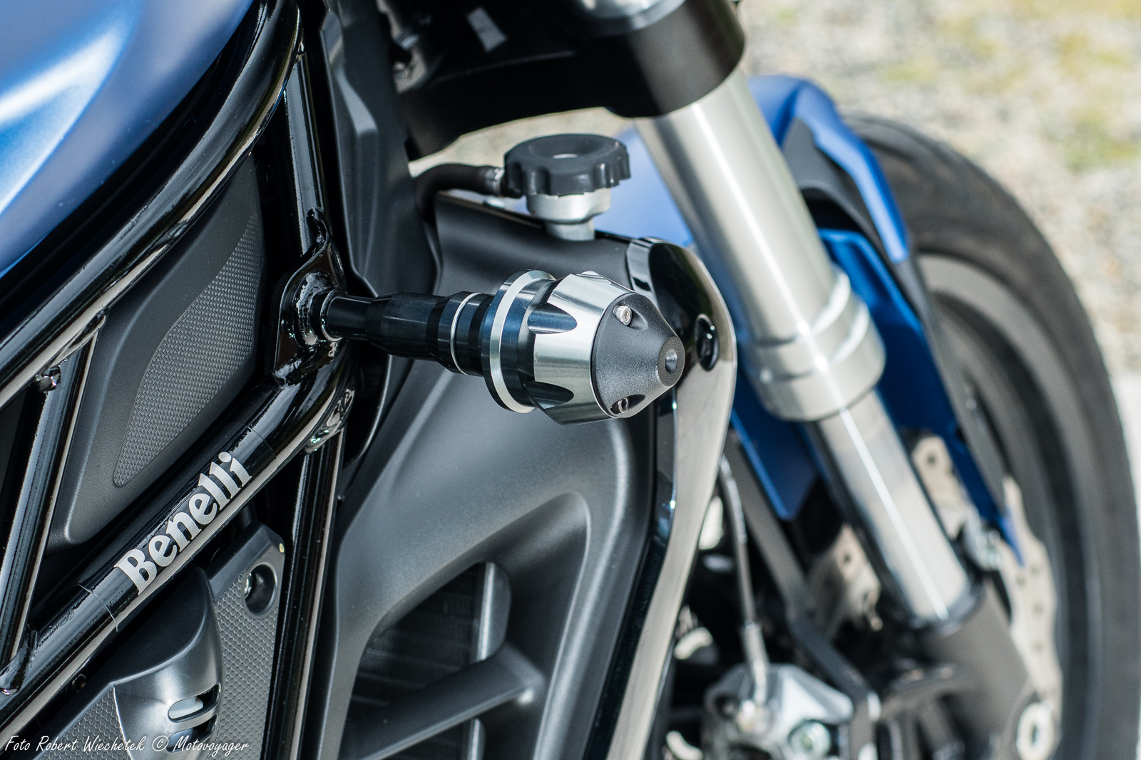 Zaskakująco dobrze! Przy jeździe na wprost, nawet przy maksymalnych prędkościach, nie wężykuje i prowadzi się jak po sznurku. Świetnie chodzi po winklach i zachęca do mocniejszych przechyłów. Szeroko poprowadzone podnóżki sprawią, że w głębszym złożeniu poczujesz się jak Rossi, trąc nimi o asfalt. To wszystko możliwe jest dzięki bardzo dobrze pracującemu zawieszeniu, mało chopperowej ramie z normalnym kątem główki oraz świetnym oponom stosowanym przez Benelli na pierwszy montaż – czyli Pirelli Angel ST.