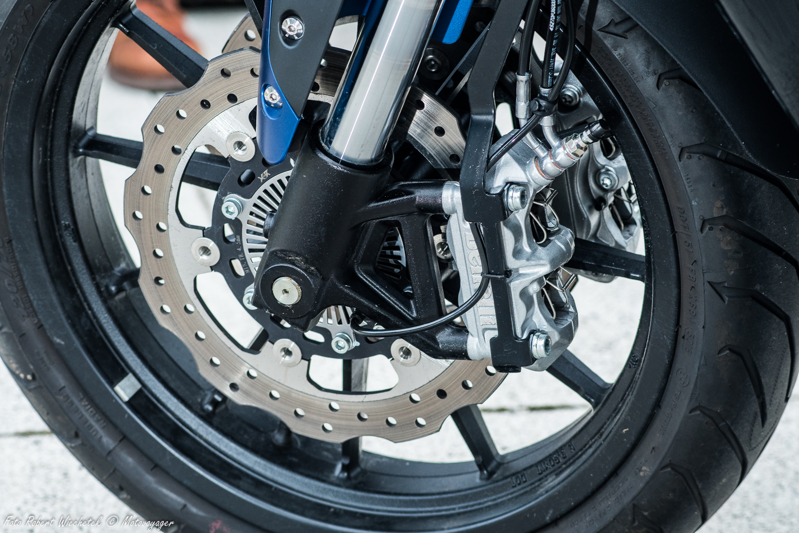 Hamulce – klasa sama w sobie, charakterystyczna dla marki. Dwa czterotłoczkowe zaciski z tarczami 280 mm z przodu. To wystarczy, by skutecznie zatrzymać ten motocykl. Dozowalność – bomba. Za hamulce piątka z plusem.