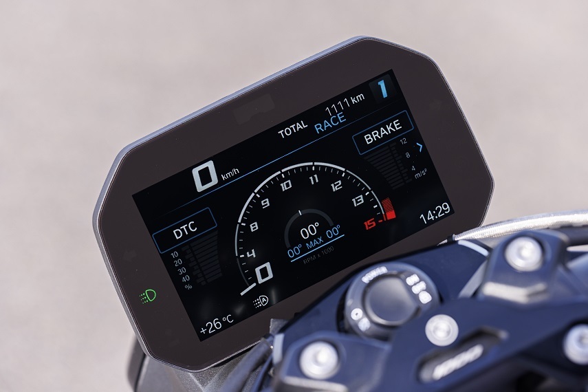 Zakrętowy ABS Pro z systemem Slide Control, pozwalający do pewnego stopnia na uślizgi kół przy hamowaniu oraz system DBC, dynamicznej kontroli hamowania. Siedem trybów jazdy (Rain, Road, Dynamic, Race, Race Pro 1, Race Pro 2, Race Pro 3). System DTC, czyli dynamicznej kontroli trakcji, którą można wyłączyć podczas jazdy jednym przyciskiem znajdującym się na lewej konsoli kierownicy. Quickshifter działający w górę i w dół. System Wheelie Control nie pozwalający unieść się zbyt wysoko przedniemu kołu podczas jazdy czy ruszania. Launch Control – czyli tryb wspomagający sportowy start z optymalnym wykorzystaniem mocy silnika. System HSC – wspomaganie ruszania pod górkę. Pit-Lane-Limiter, czyli automatyczny, elektroniczny ogranicznik prędkości stosowany podczas wyścigów, przy zjeździe do depo. System bezkluczykowy. Elektronicznie sterowane zawieszenie, czyli Dynamic Damping Control, pozwalające na dopasowanie charakterystyki pracy amortyzatorów do mocy silnika i aktualnych warunków drogowych. Wszystkim tym sterujemy za pomocą przycisków i multicontrolera na kierownicy, wybierając odpowiednie opcje na kolorowym wyświetlaczu TFT o przekątnej 6,5 cala. Sporo tego, prawda?