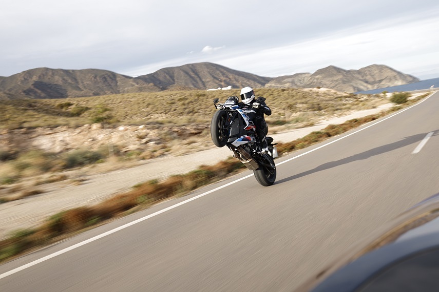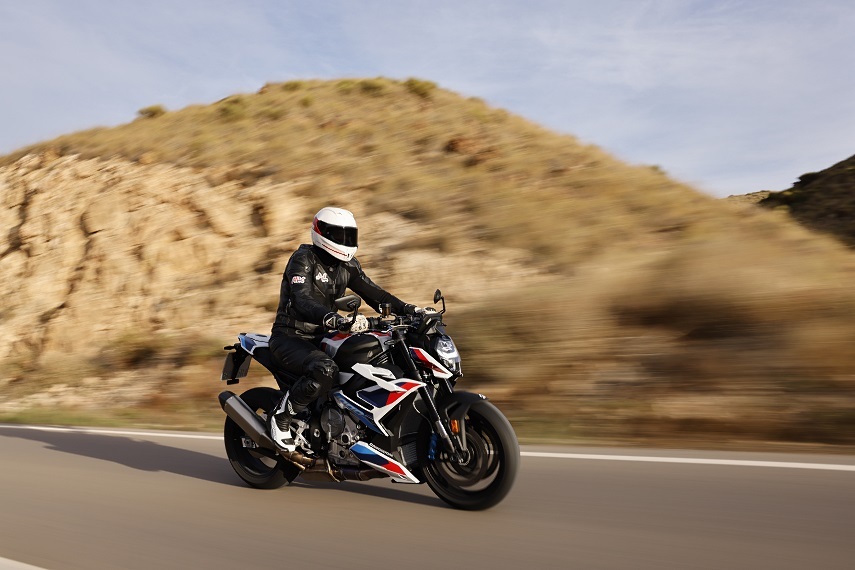 Podczas naszej przejażdżki po krętych asfaltach Andaluzji trafiliśmy w końcu na Tor Almeria (Circuito de Almeria). Ciekawostką jest to, że obiekt ten sąsiaduje z drugim, podobnym torem – Circuito Nuevo Andalucía. Obiekty można ze sobą połączyć i ich wspólna nitka wynosi około 8 kilometrów. Niezła sprawa! My zostaliśmy wpuszczeni na kilka okrążeń tego pierwszego, aby zobaczyć jak w warunkach torowych daje sobie radę nowa M-ka, ale przede wszystkim, by bez skrępowania odkręcić manetkę gazu na długiej prostej toru. Przyspieszenia są niesamowite. 210 KM katapultuje mnie z ostatniego zakrętu przed prostą, pozwalając rozpędzić się do 250 km/h. Wiatr zupełnie nie przeszkadza, mój Schuberth SR2 jest tak dopasowany, że nawet taki pęd powietrza nie opiera mi wnętrza kasku na twarzy. Motocykl jest na drogowych oponach, więc Jurgen Fuchs, kierowca jeżdżący w mistrzostwach świata w latach 90., prowadzi nas w miarę delikatnym tempem.