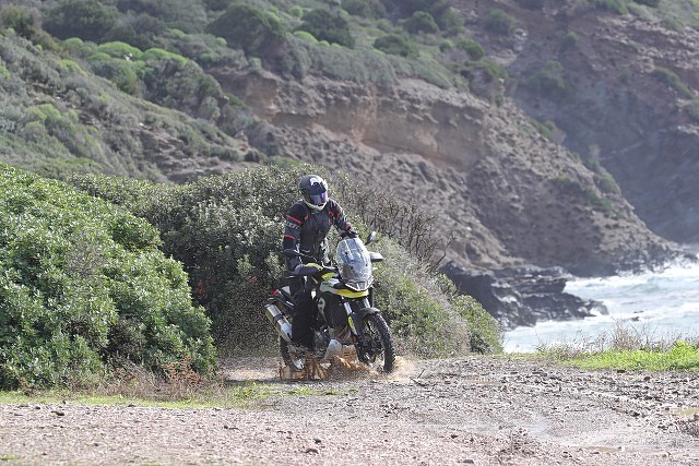 Droga, okalająca wyspę od jej południowej strony, zaczyna się wić. Jedziemy wzdłuż Morza Śródziemnego, asfalt jest gładki i wyraźnie przesycha. Czas odkręcić gaz. Mimo 21-calowego koła z przodu, nie mam wrażenia, że motocykl ospale reaguje na próby przerzucania go z ciasnego zakrętu w zakręt. Prowadzi się bardziej jak przyciężkie supermoto na siedemnastkach, a nie całkiem sporych rozmiarów, wysokie enduro. Nawet z zamkniętymi oczami zorientowałbym się jednak, że jest to motocykl przeznaczony również do jazdy w offie, ale dopiero po mocniejszym naciśnięciu klamki hamulca. I nie, nie chodzi mi o brak hamowania, bo jest wprost przeciwnie – hamulce są bardzo dobre – ale o charakterystyczne nurkowanie przodu.