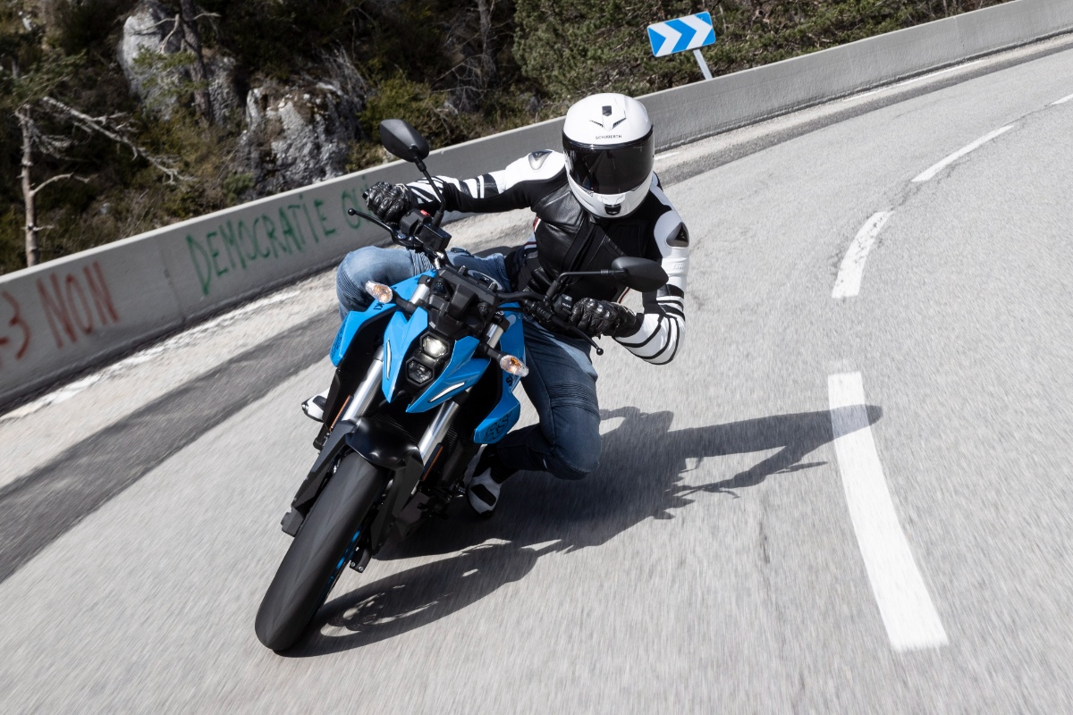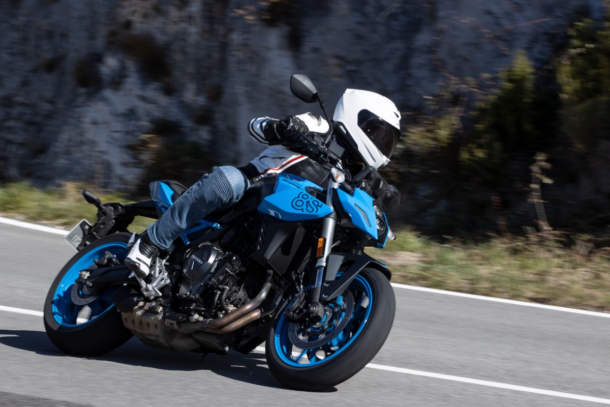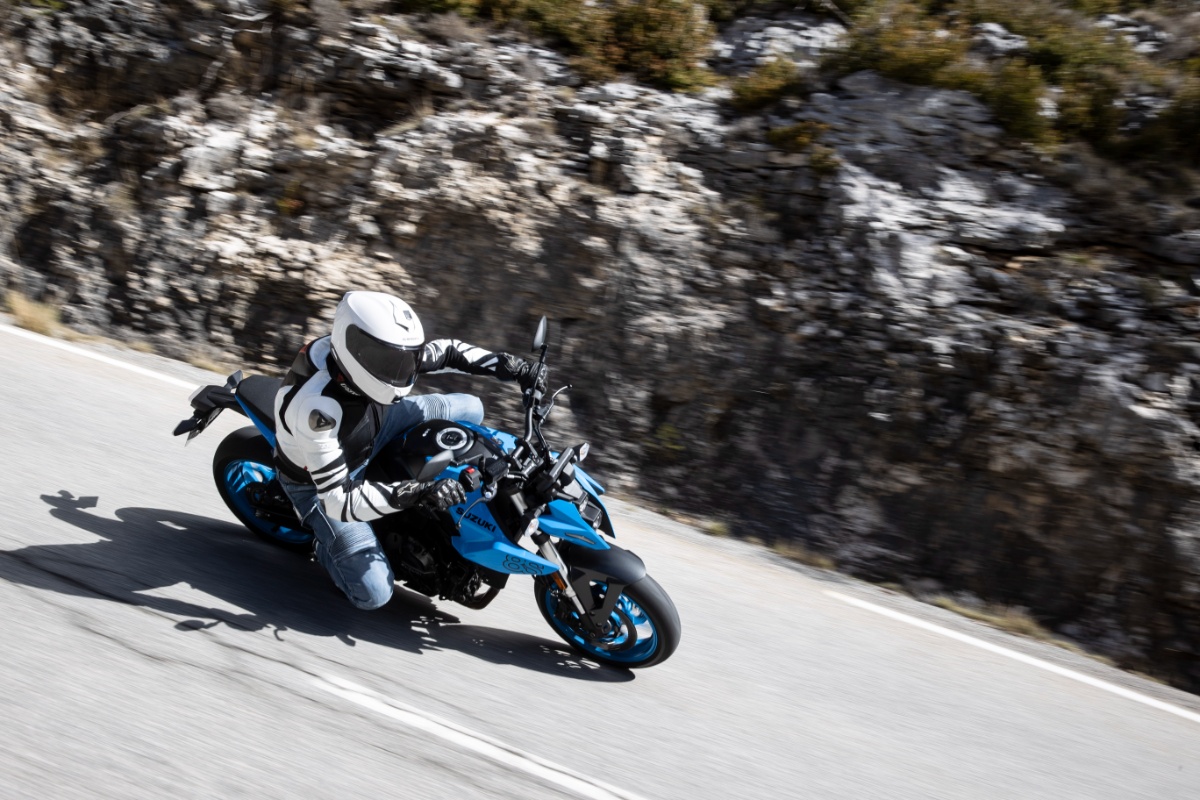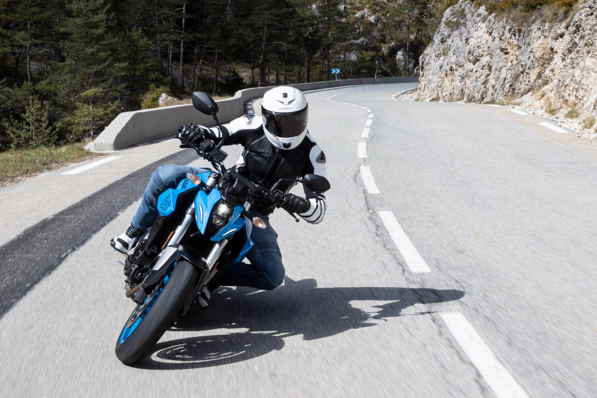 Dobrze, ale wróćmy do pierwszego wrażenia, jakie zrobił na mnie GSX-8S. Ot zwykły, kolejny naked, nic specjalnego. Widać, że nie jest to motocykl drogi – np. zawias z przodu nie jest regulowany, tylny ma tylko regulację napięcia wstępnego. Za kierownicą też nie ma jakiś splendorów. Ot, normalnie. Ruszyłem. Przejechałem parę metrów, jednostka fajnie wkręca się od dołu, trzy mapy do wyboru – oczywiście start na A – najmocniejszej. Hamulce żyleta, pozycja za kierownicą odprężona, ale też ustawiająca ciało kierowcy w gotowości do działania. Kanapa średnio twarda, dużo miejsca na nogi, podnóżki w miarę wysoko. Jadę tak w tłumie innych dziennikarzy, bo z miejscowości Antibes nad samym morzem startowaliśmy w 20 motocykli.