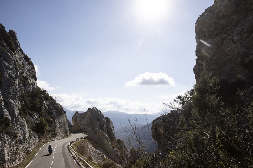 Naszą grupę prowadził Francuz, który znał zakręty Drogi Napoleona i innych alpejskich asfaltów jak własną kieszeń. Prowadził nas iście superbike’owym tempem, chłop musiał mieć jakieś wyścigowe doświadczenie. Oczywiście jak to na takich testach – każdy ma prawo jechać swoją prędkością, w swoim komforcie. Mi niestety już włączył się tryb kozaczenia i po połowie dnia, gdzie jeździliśmy po tych górach naprawdę z nieprzyzwoicie dużymi prędkościami, czułem z moim nowym motocyklem jedność. Ale do rzeczy. Po przerwie obiadowej przewodnik odpalił wrotki. Kto mógł i chciał nadążyć trzymał się za nim. Grupa testujących szybko podzieliła się na 5 osób z przodu, które nadążały oraz całą resztę, również porwaną w zależności od tempa testujących. Trzymałem się w tej pierwszej, co – zdziwiło mnie – nie sprawiało mi to większego problemu. Nie stresowałem się, ani razu nie przestraszyłem się, nie zrobiłem niczego, aby musieć się ratować.