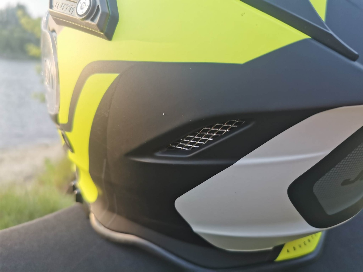 Boczne wloty na szczęce kierują powietrze bezpośrednio na szybę. Dwa górne natomiast rozprowadzają powietrze w podwójnym dnie skorupy, co nie przekłada się bezpośrednio na poczucie chłodzenia wewnątrz kasku. Jeżeli chcecie jeździć w tym kasku w upalne lato, to raczej w goglach, wtedy na brak cyrkulacji powietrza nie powinniście narzekać. Dodatkowo w chłodne dni szczelność kasku jest dużo ważniejsza od przewiewów.